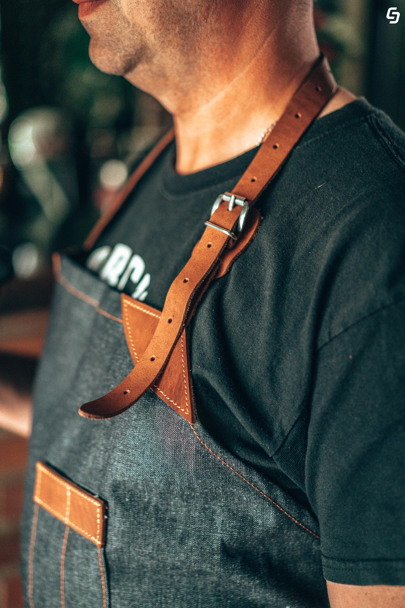 In turn, the chest pocket and the large pocket at the bottom of the apron are a practical solution useful while working.