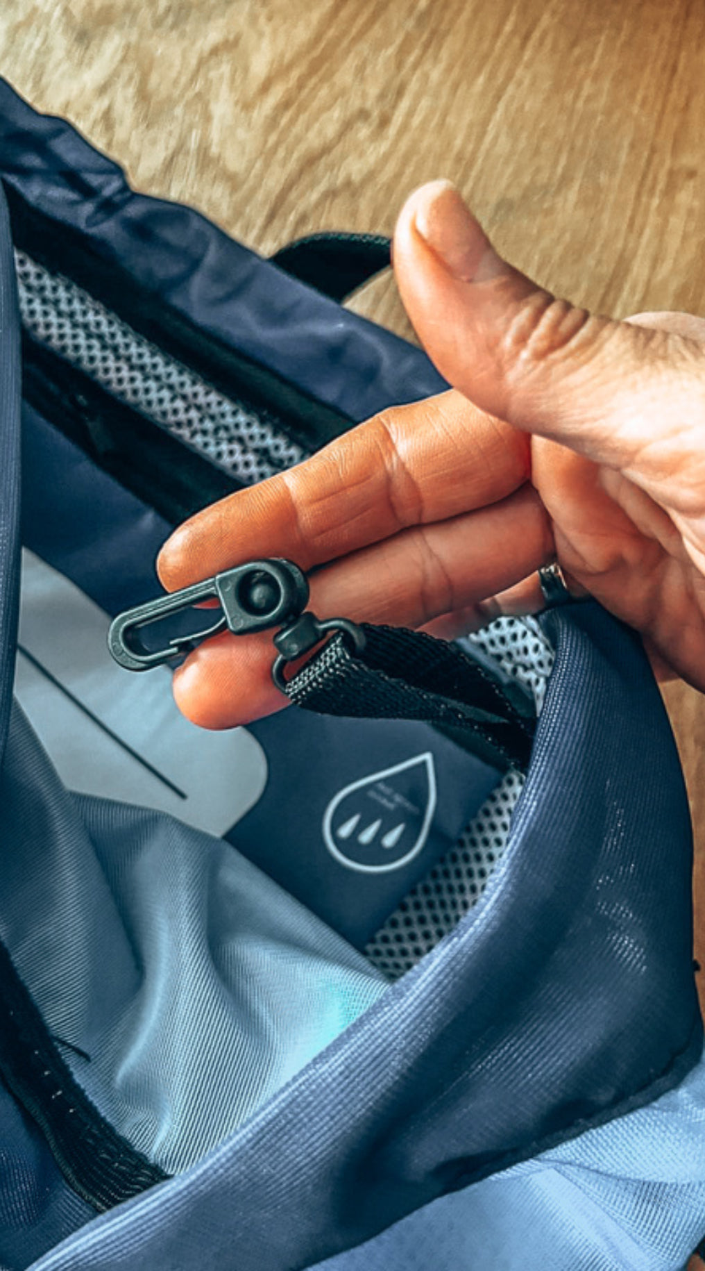 Dzięki rączce z taśmy łatwo możemy go powiesić pod prysznicem, w kabinie do przebierania lub hali. W środku znajdziemy również wodoodporną zamykaną na zamek kieszeń na telefon lub inne drobiazgi.