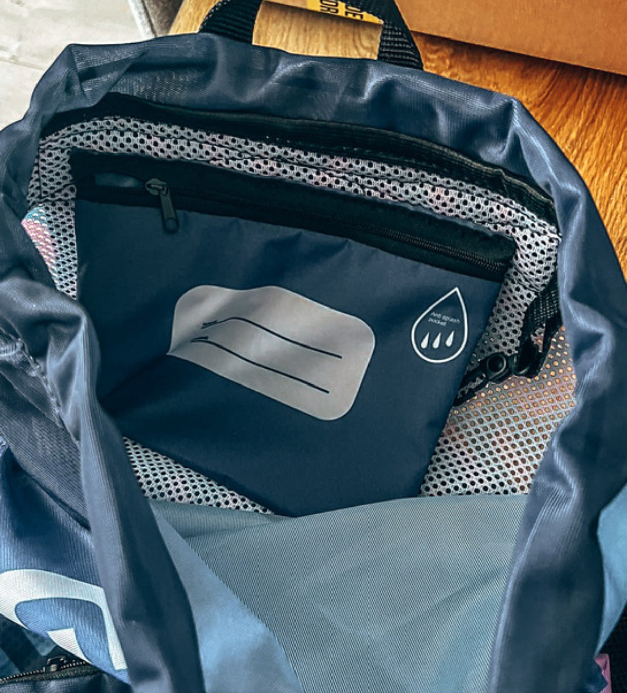 Materiał siatkowy bardzo szybko schnie i nie chłonie wilgoci. Wewnątrz znajduje się wodoodporna kieszeń, a dwie kieszenie zewnętrzne pomagają zachować porządek po intensywnym treningu.